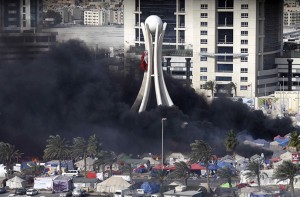 (FILES) — File picture dated March 16, 2011 shows black smoke billowing from burning tents in Pearl Square in Bahraini capital Manama. Bahrain’s opposition has called for protests to mark the third anniversary of an Arab Spring revolt led by the Shiite majority that was brutally crushed by the Saudi-backed Sunni monarchy. AFP PHOTO/JOSEPH EID