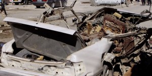 A federal policeman stands guard at the scene of a car bomb attack in the Shiite stronghold of Sadr City, Baghdad, Iraq, Tuesday, March 19, 2013. Insurgents unleashed deadly attacks Tuesday against Shiite areas in Baghdad, killing and wounding scores of people, police said. (AP Photo/ Karim Kadim)